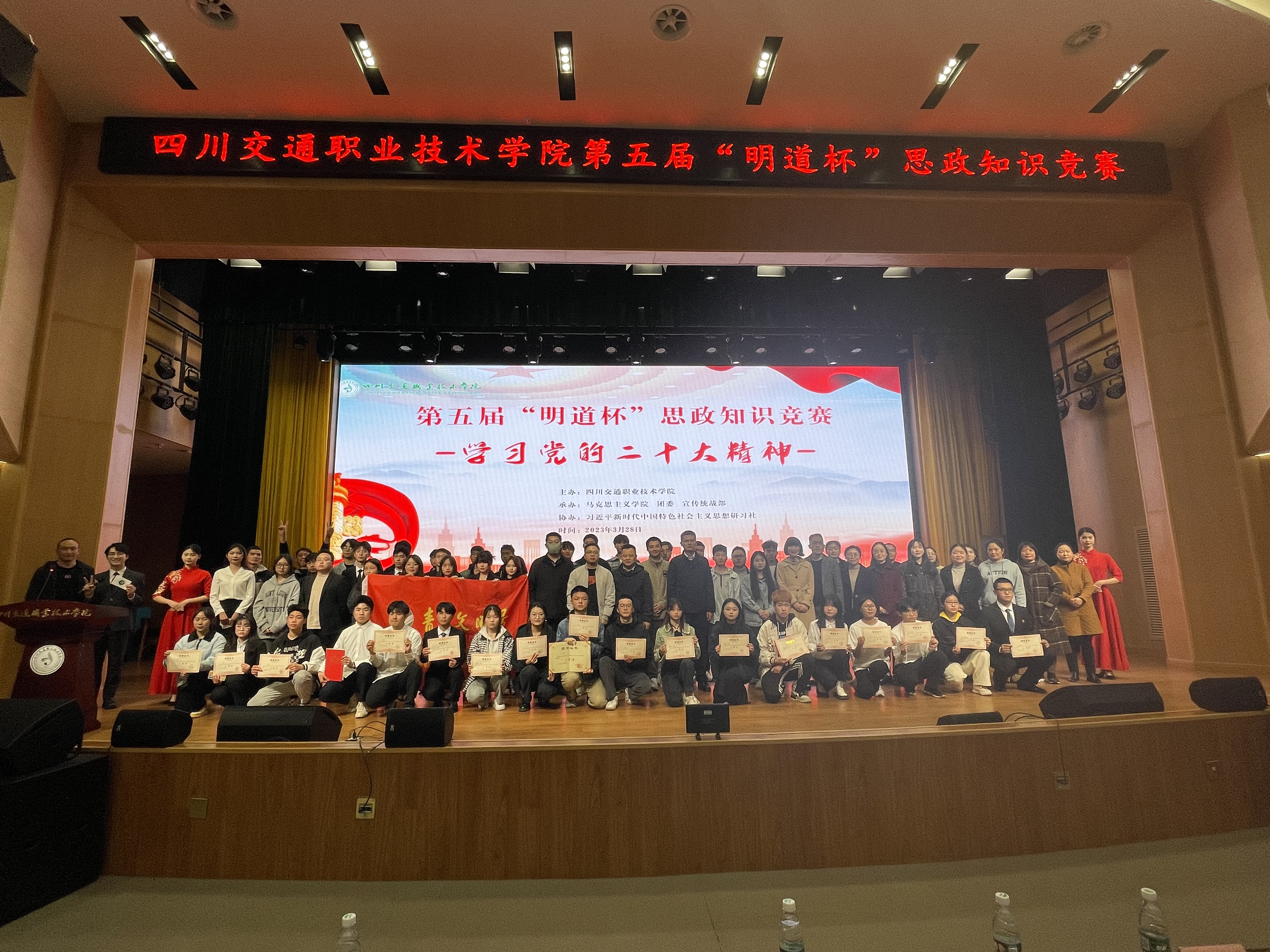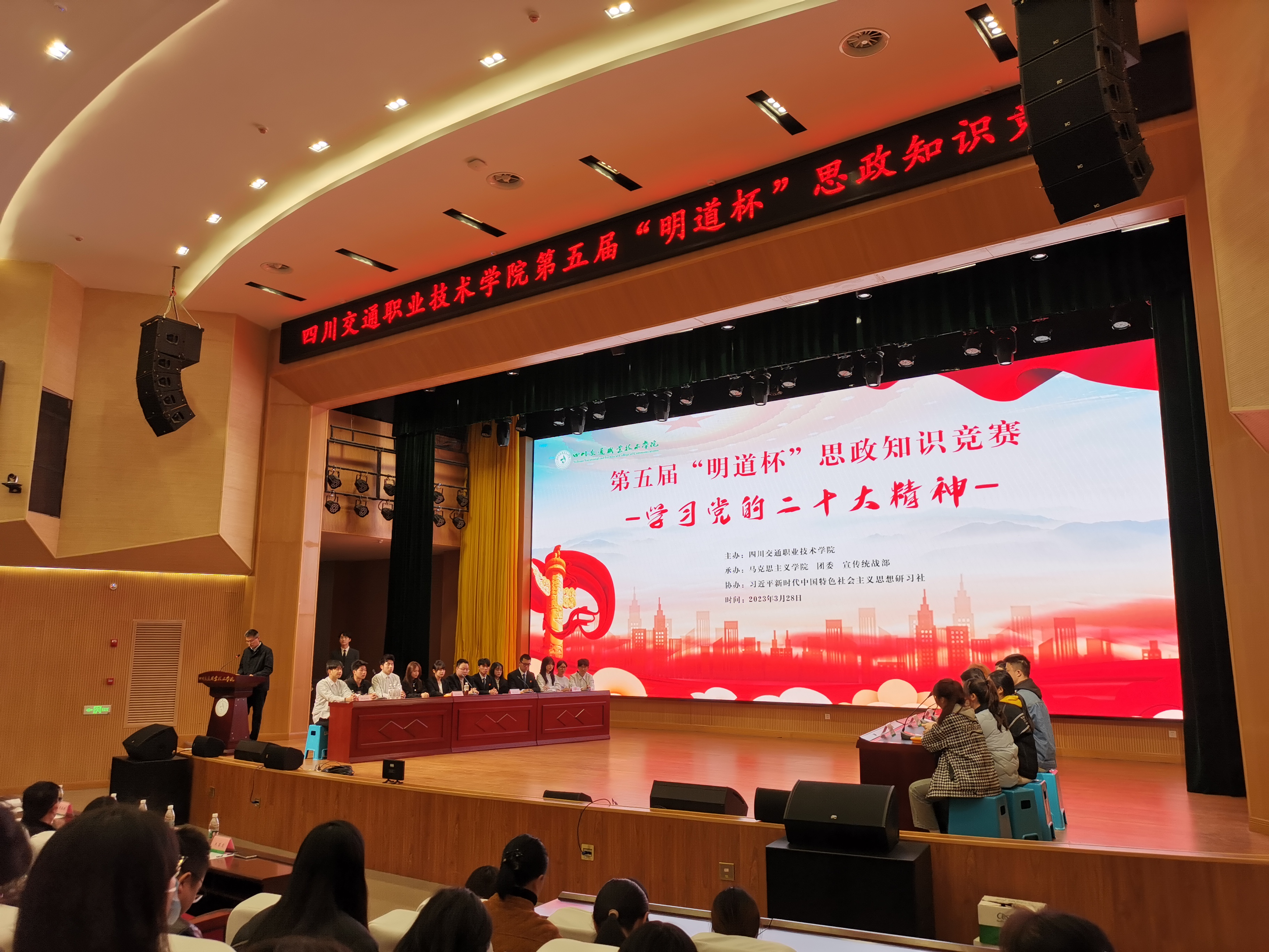 为学习贯彻党的二十大精神,引导员工正确认识中国发展大势,树立为第二个百年奋斗目标奋斗的信念和信心,3月28日下午,公司在厚学楼报告厅举办了“明道杯”党的二十大知识竞赛,此赛事由太阳成集团tyc、团委和宣传统战部承办,习近平新时代中国特色社会主义思想研习社协办。公司副经理李红,太阳成集团tyc经理王蓉霞、公共课教学部主任黄蜀云、团委书记夏洋、宣统部副部长周凯、学工部副部长张春明和太阳成集团tyc全体教职工、各系员工代表观众出席比赛现场。