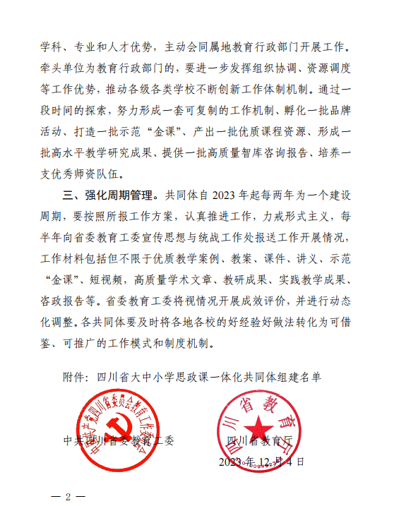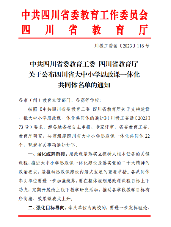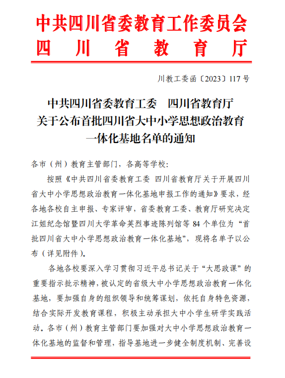 近日,中共四川省委教育工委、四川省教育厅发布《中共四川省委教育工委四川省教育厅关于公布四川省大中小学思政课一体化共同体名单的通知》(川教工委函【2023】116号)《中共四川省委教育工委 四川省教育厅关于公布首批四川省大中小学思想政治教育一体化基地名单的通知》(川教工委函【2023】117号),公司成为四川省大中小学思政课一体化共同体牵头单位并入选首批四川省大中小学思想政治教育一体化基地。