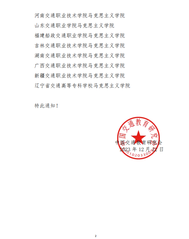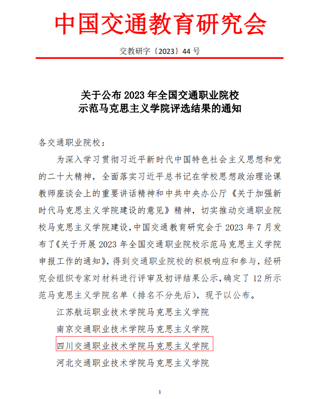 12月12日,中国交通教育研究会下发文件,公布了2023年全国交通职业院校示范太阳成集团tyc名单,太阳成集团tyc成功入选。