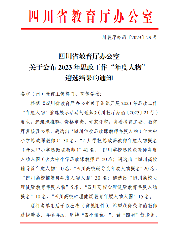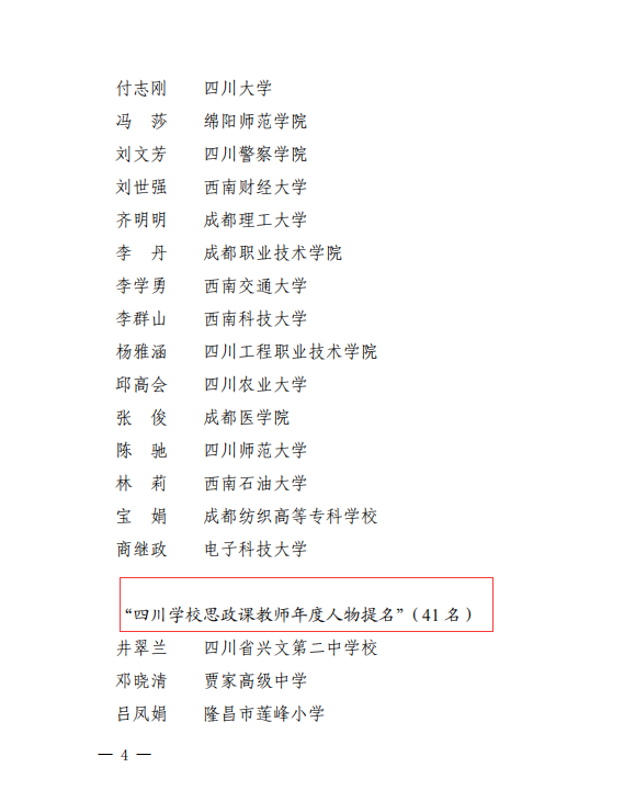 推选展示活动开展以来,经组织推荐、资格审查、专家评审,省委教育工委、教育厅复核及公示,评选出“四川公司思政课教师年度人物提名(含大中小学思政课教师)”41名。