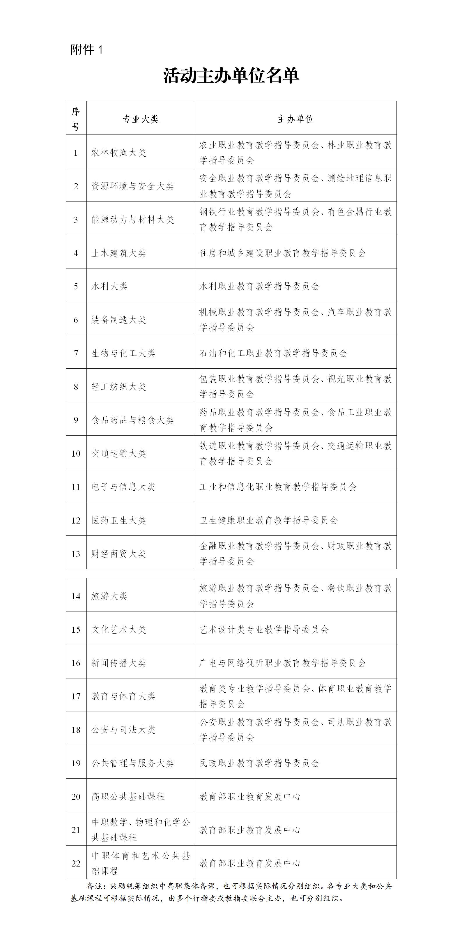(一)活动组织。各专业大类的活动由全国行业职业公司产品指导委员会、教育部职业院校教学(教育)指导委员会(以下简称行指委、教指委)主办,行指委、教指委推荐相关专业建设水平高、课程思政建设基础好的职业公司,报经教育部行指委工作办公室同意后承办;公共基础课的活动由教育部职业教育发展中心主办,组织办学水平高、课程思政建设基础好的职业公司承办(活动主办单位名单见附件1)。